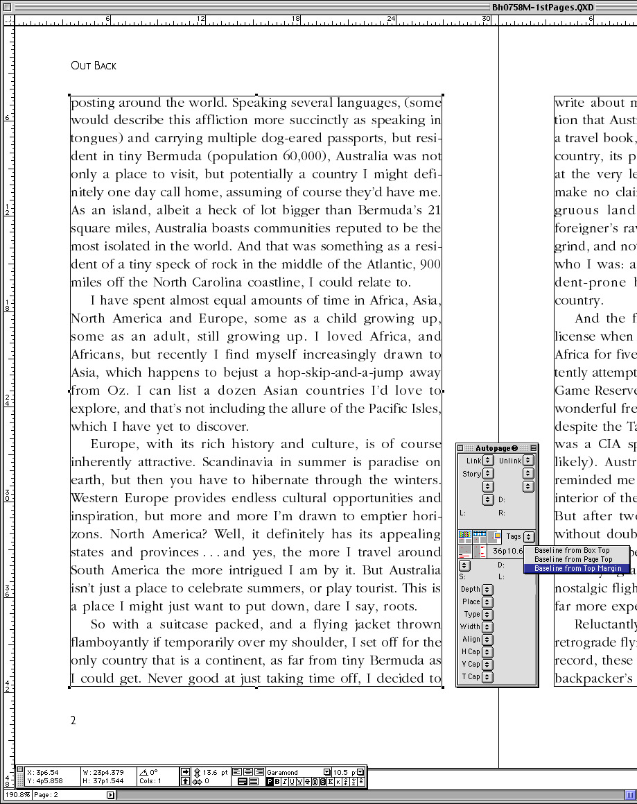 Autopage provides feedback on the current baseline via the XTension palette, and this information is used to determine the default page depth. The easiest method is to prepare a page of normal body copy text; that is, the same typeface, size and leading for the whole page, and that page should have the standard number of lines you would like on each page of the book. By placing your cursor on the last line of the page, Autopage will tell you how far this baseline is from the top margin, which can be used as the optimum page depth. Of course, you can specify that this optimum depth is able to alter during pagination, within your limits, and to prevent page depths from varying too much from one spread to the next. By making the minimum, optimum, and maximum settings the same, Autopage will make each page the same depth, without variation.